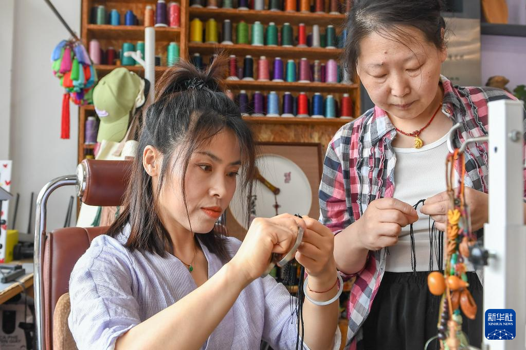 6月20日,在吉林省長春市,徐曉雪(左)與團隊成員編繩結工藝品。