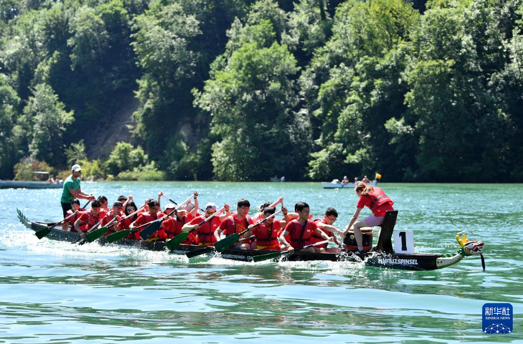 6月25日,在瑞士埃格利紹,瑞士蘇黎世州華僑華人組織的“龍戰隊”參加賽龍舟活動。