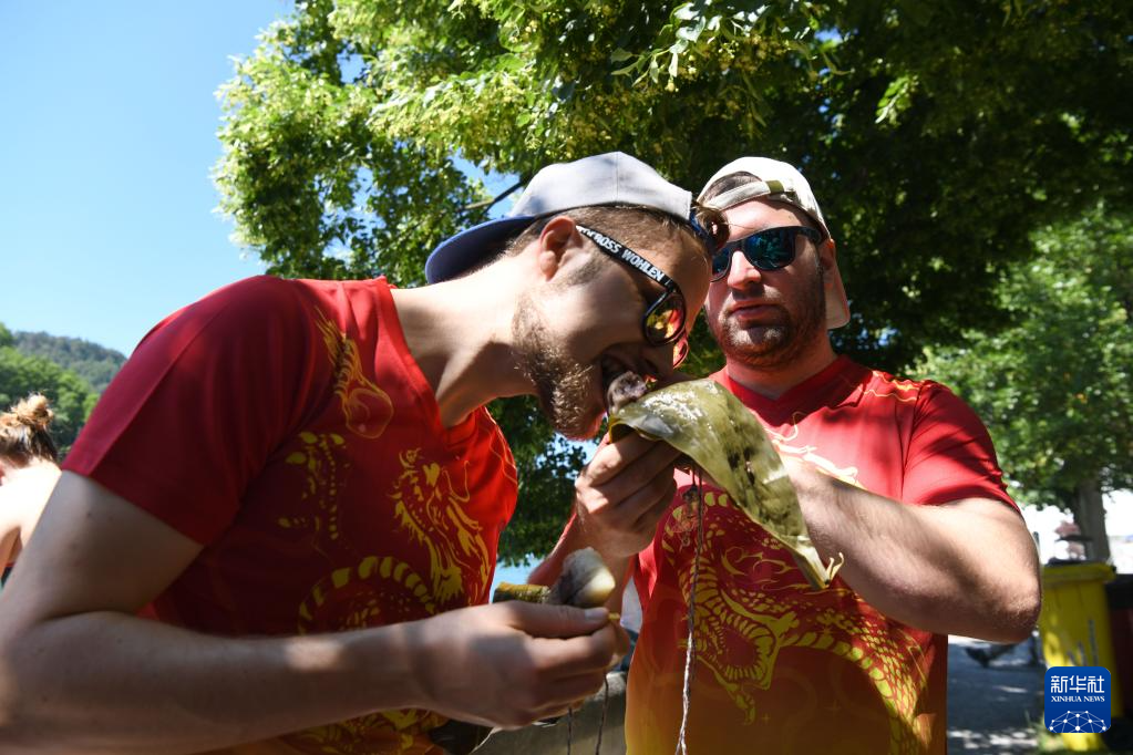 6月25日,在瑞士埃格利紹,人們在賽龍舟活動上品嘗中國粽子。