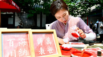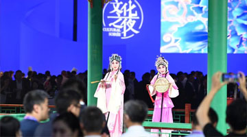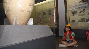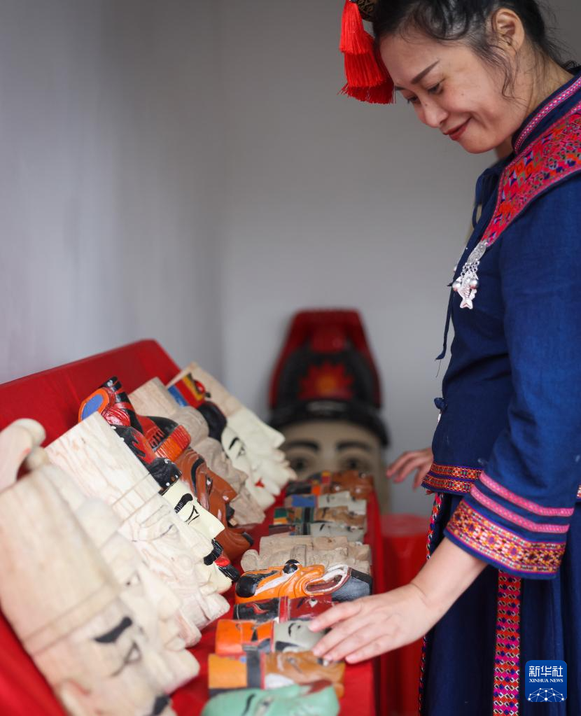 6月27日,在廣西環江毛南族自治縣下南鄉毛南民族文化園,身著毛南族服飾的婦女觀賞毛南族儺面具。