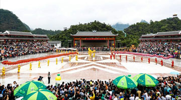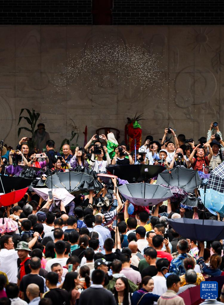 6月27日,在廣西環江毛南族自治縣下南鄉毛南民族文化園,村民用雨傘接“福祿壽米”祈福。