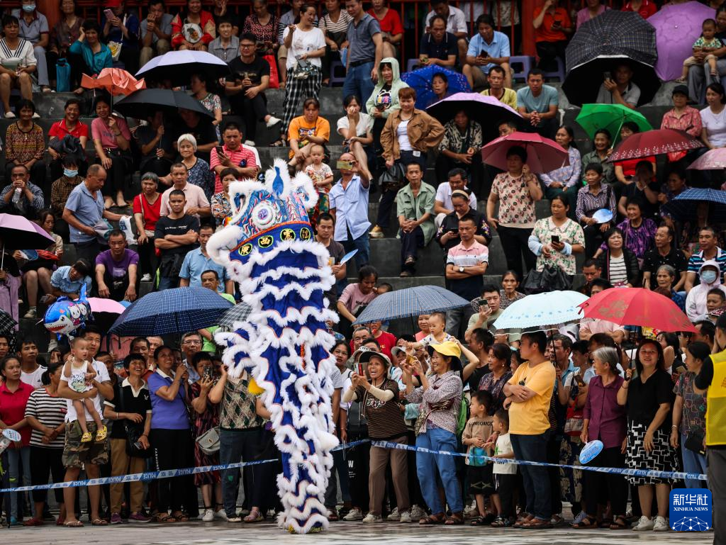 6月27日,在廣西環江毛南族自治縣下南鄉毛南民族文化園,村民觀看舞獅表演。