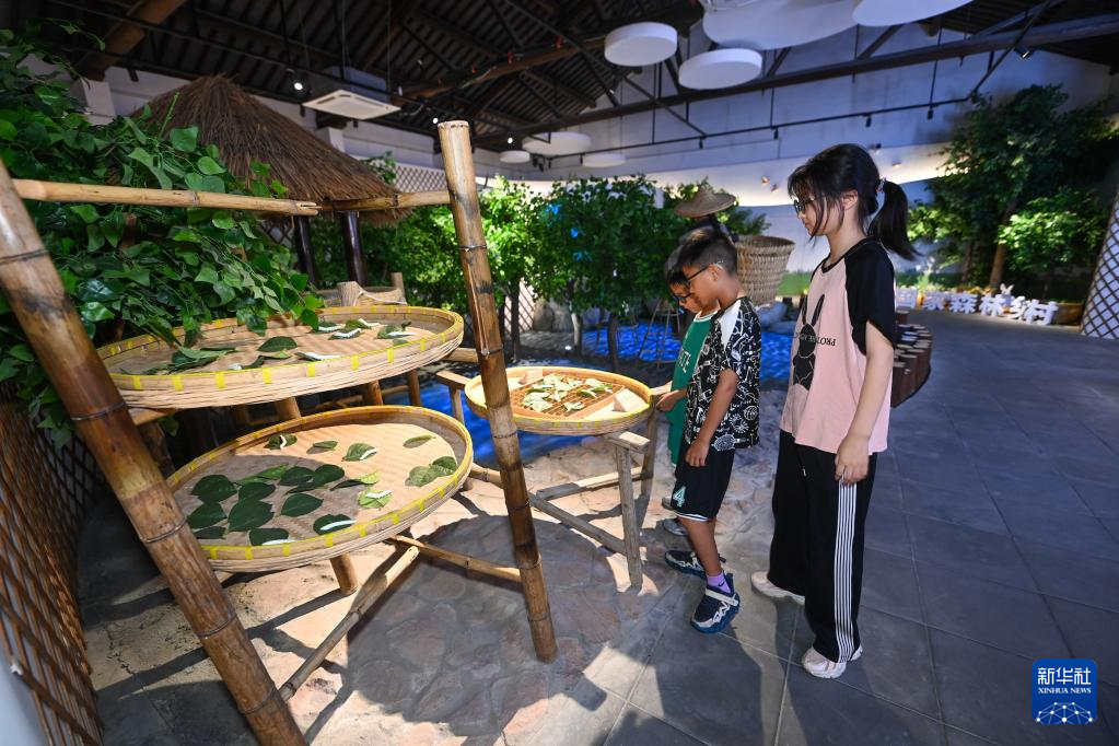 7月5日,孩子們正在參觀織里鎮伍浦村文化禮堂內的蠶桑文化展示。