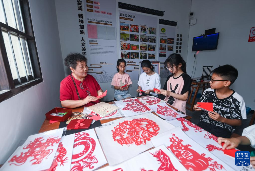 7月5日,剪紙老師在伍浦村文化禮堂內的暑期公益課堂教孩子們剪紙技藝。