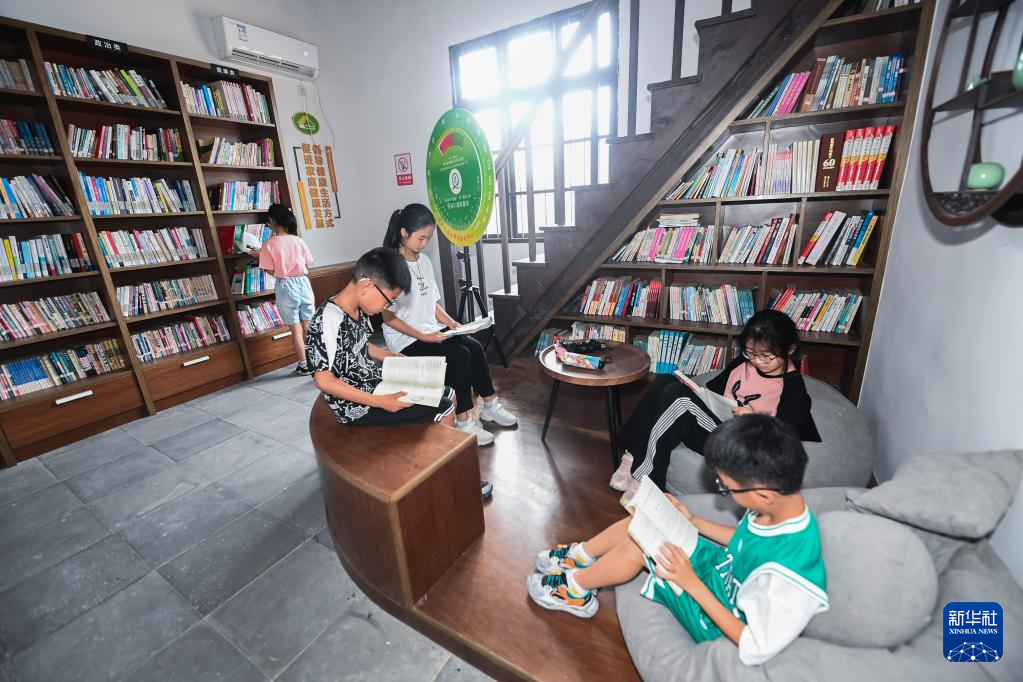 7月5日,孩子們在織里鎮伍浦村文化禮堂內的圖書室看書。