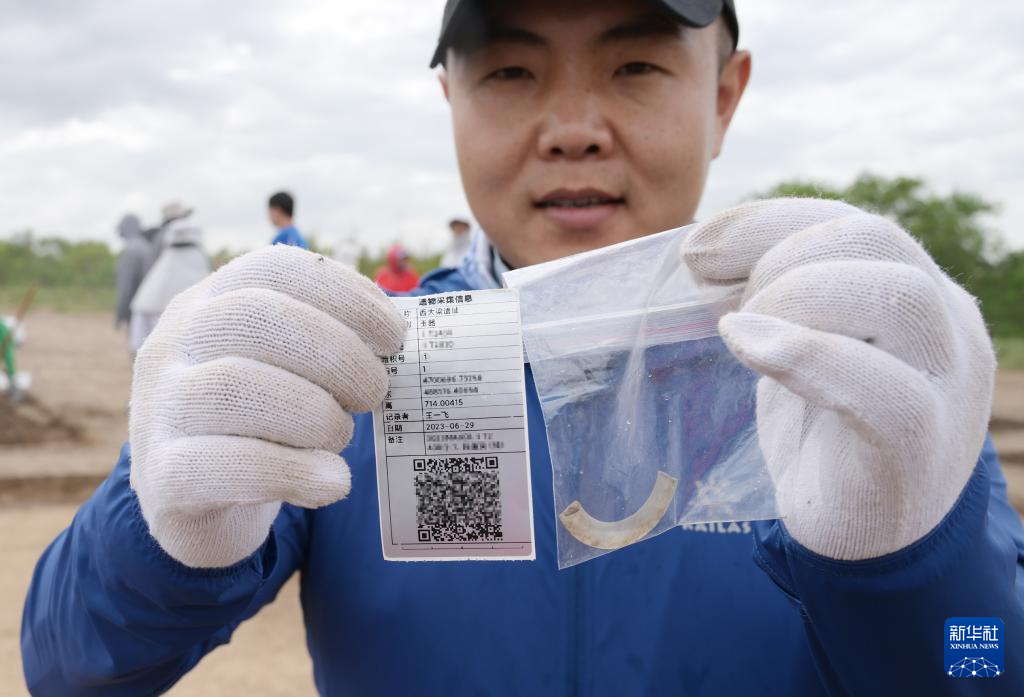 7月5日,考古隊工作人員展示一件在遺址現場采集的文物。
