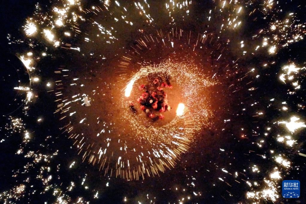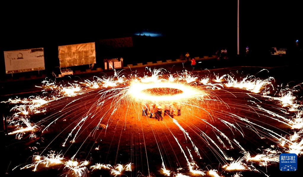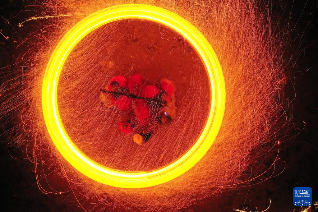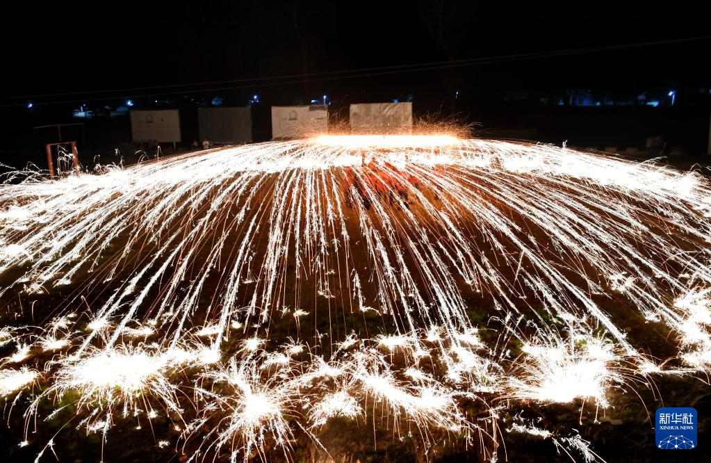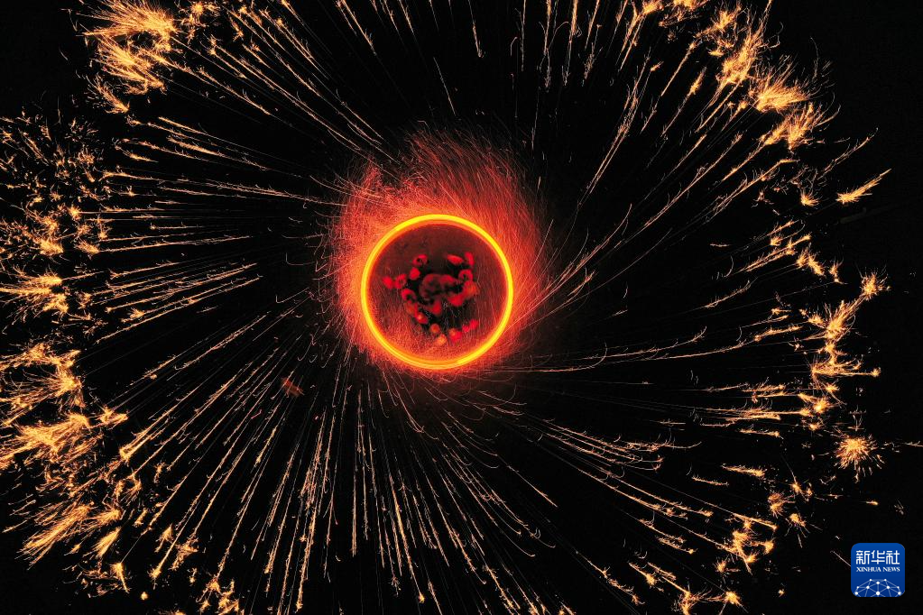 “掄花”是河北省灤平縣一項傳統民俗,已被列入國家級非物質文化遺產名錄。表演時,幾名民間藝人將木炭和碎鐵片一起放到掛在花架上的花筒中燃燒,再合力掄起花架,使花筒內升溫并向四周甩濺鐵花,形成一圈圈光線交織的光環,景象壯觀。