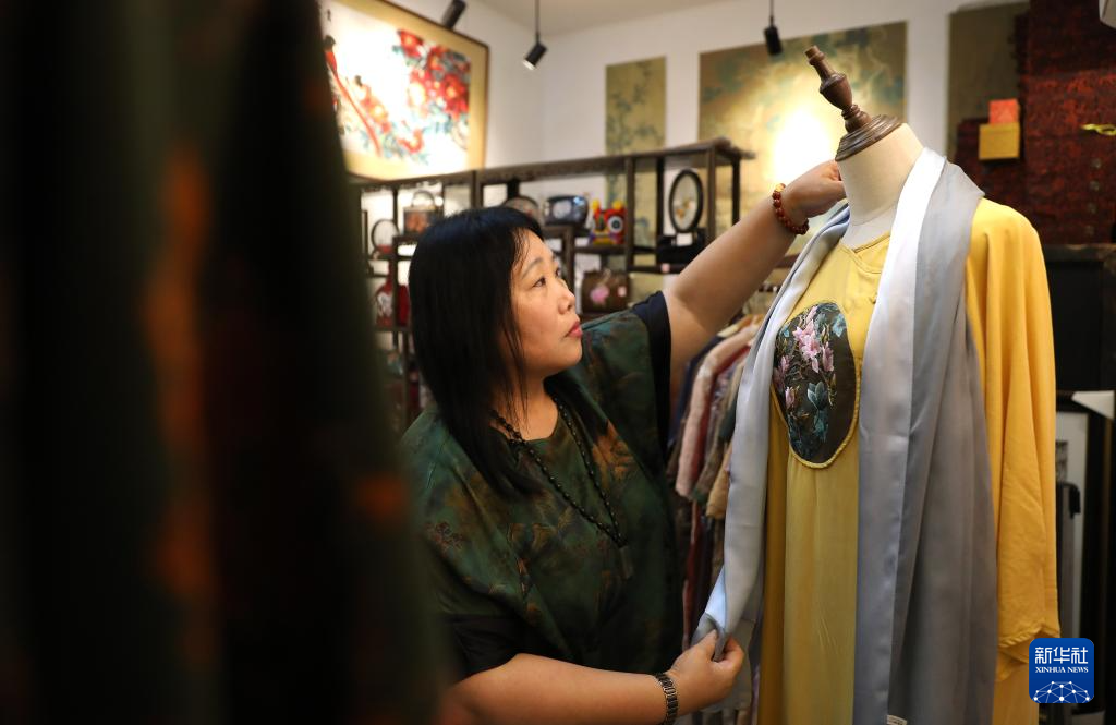 7月5日,王立君在位于遼寧省營口市遼河老街上的工作室里為她設計的帶有滿繡圖案的民族服飾進行搭配。
