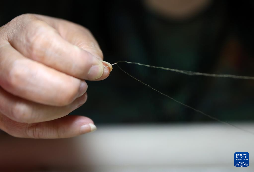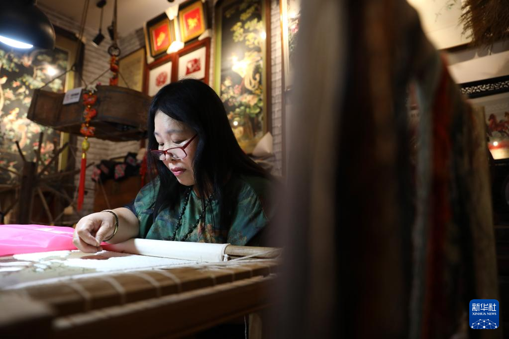 7月5日,王立君在位于遼寧省營口市遼河老街上的工作室里進行滿繡創作。