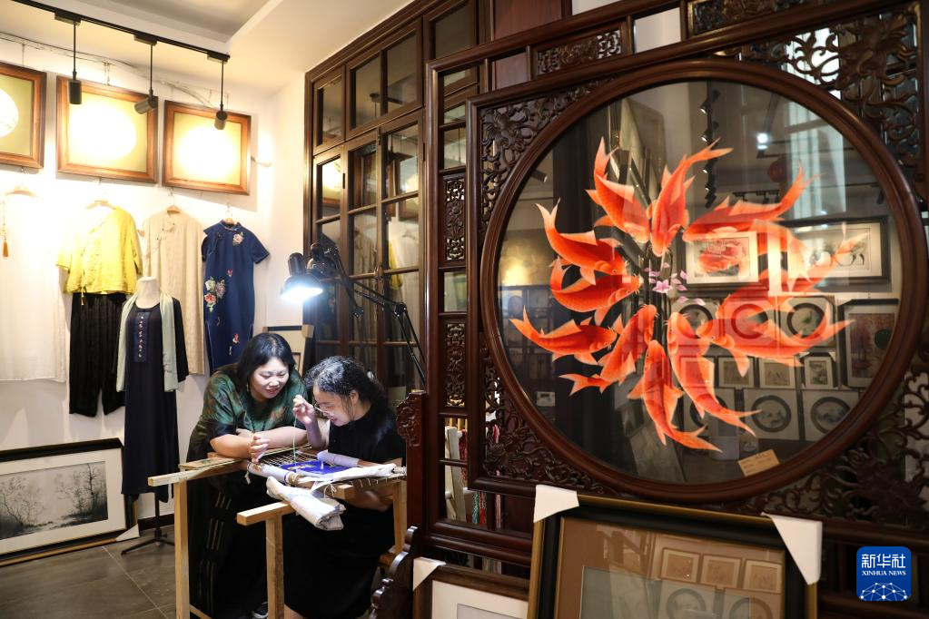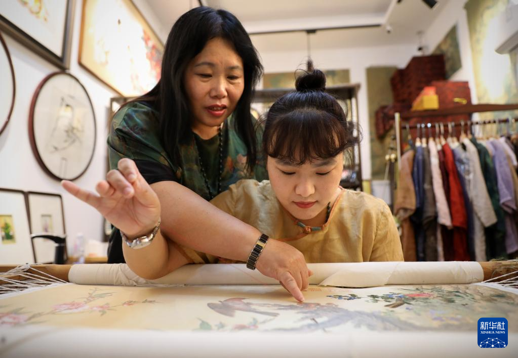 7月5日,王立君(左)在位于遼寧省營口市遼河老街上的工作室里給徒弟指導滿繡創作技藝。