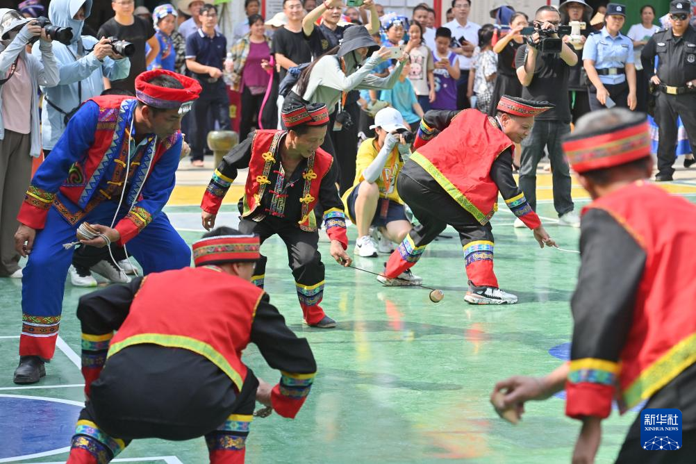 7月11日,在大化瑤族自治縣仁良村,村民在陀螺文化展演活動中打陀螺。