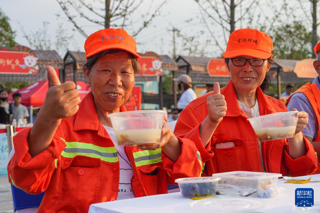7月11日,在安徽省宿州市蕭縣水墨圣泉古鎮廣場,環衛工人品嘗羊湯。