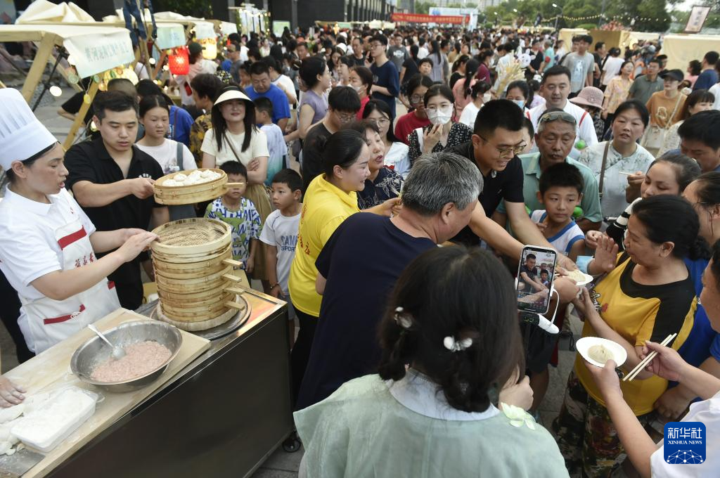 7月14日傍晚,游人在開封市開元廣場設立的“非遺市集”現場品嘗開封灌湯包。