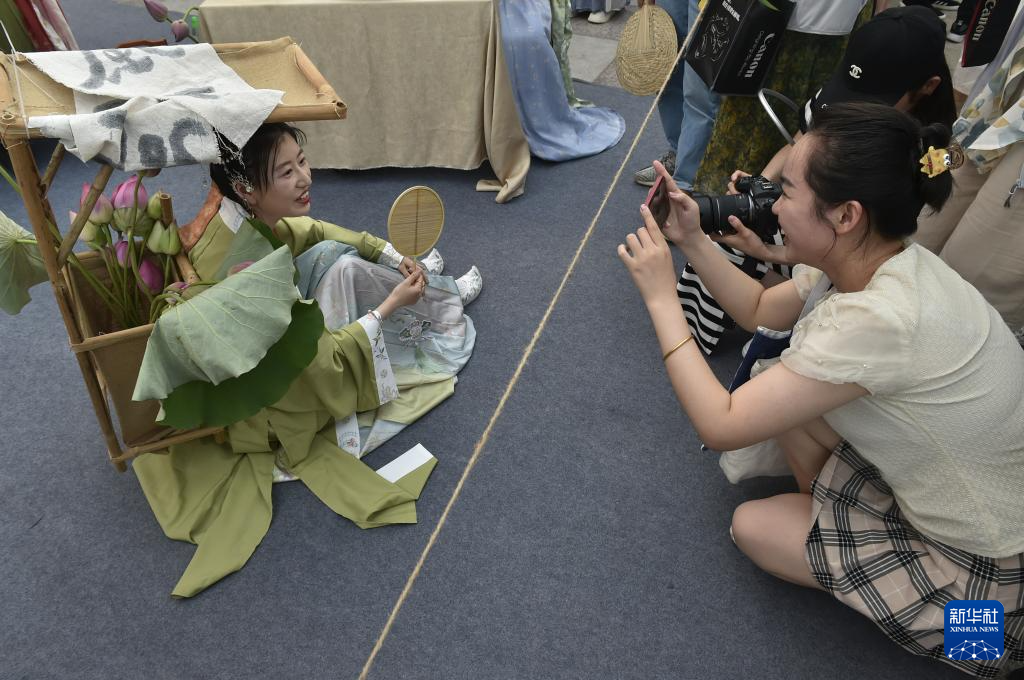7月14日傍晚,身穿古裝的游人(左)在開封市開元廣場設立的“非遺市集”現場留影。