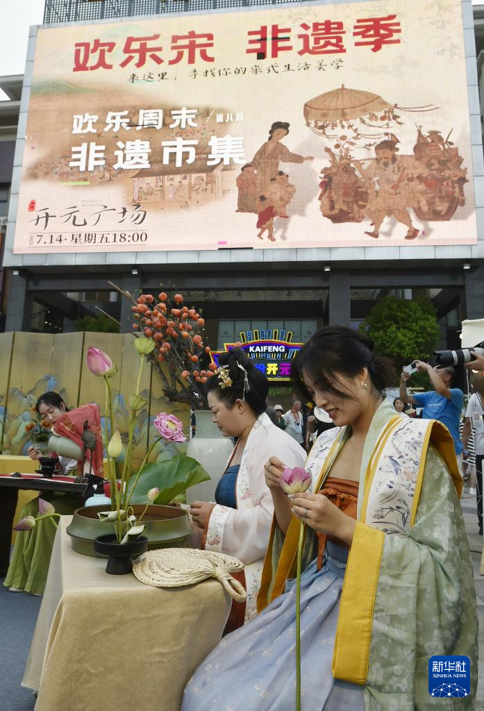 7月14日傍晚,工作人員在開封市開元廣場設立的“非遺市集”現場展示插花技藝。