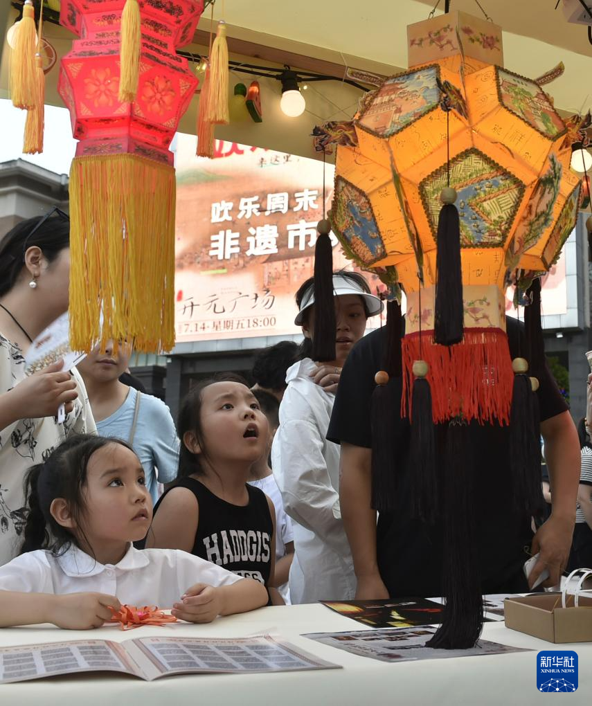 7月14日傍晚,小朋友在開封市開元廣場設立的“非遺市集”現場觀看傳統彩燈制作。
