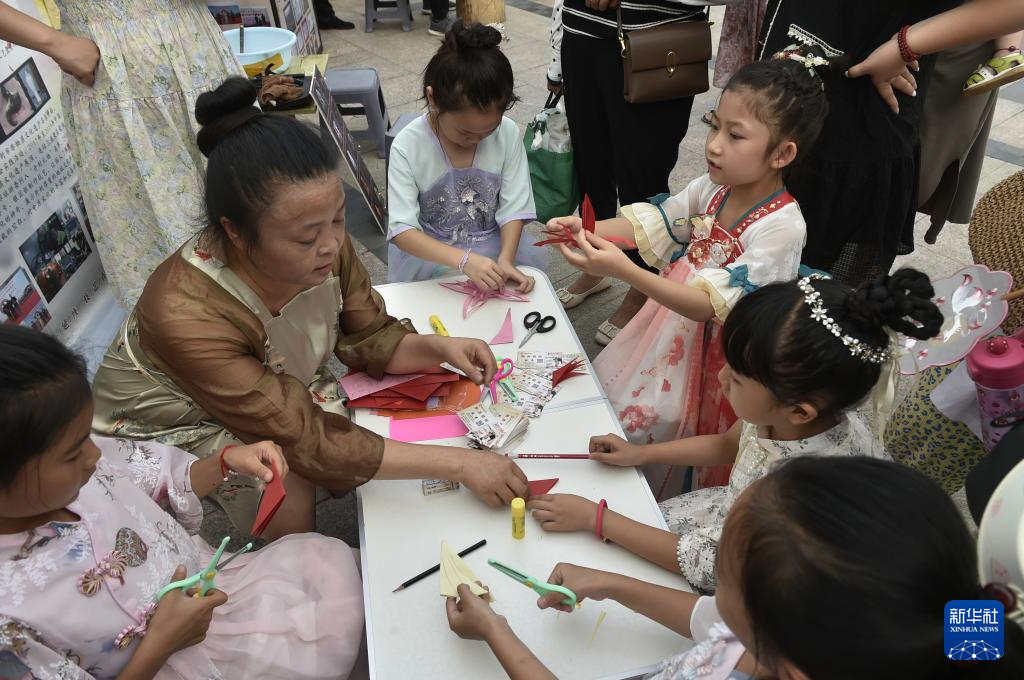 7月14日傍晚,小朋友在開封市開元廣場設立的“非遺市集”現場體驗剪紙技藝。