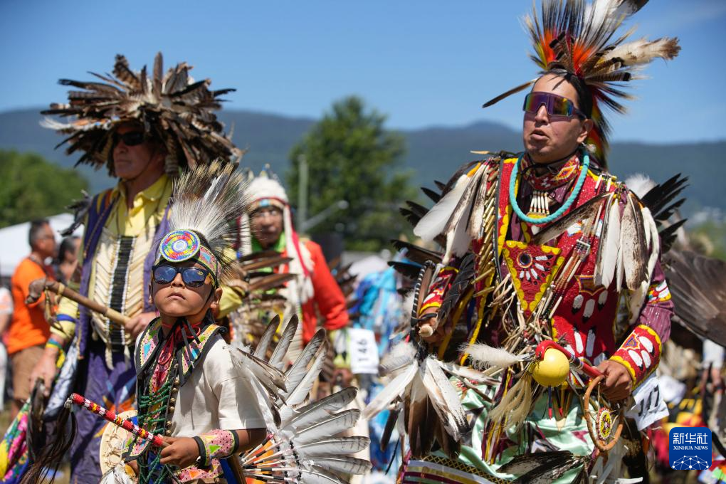 7月15日,在加拿大溫哥華,穿著傳統盛裝的印第安原住民參加“帕瓦”活動。