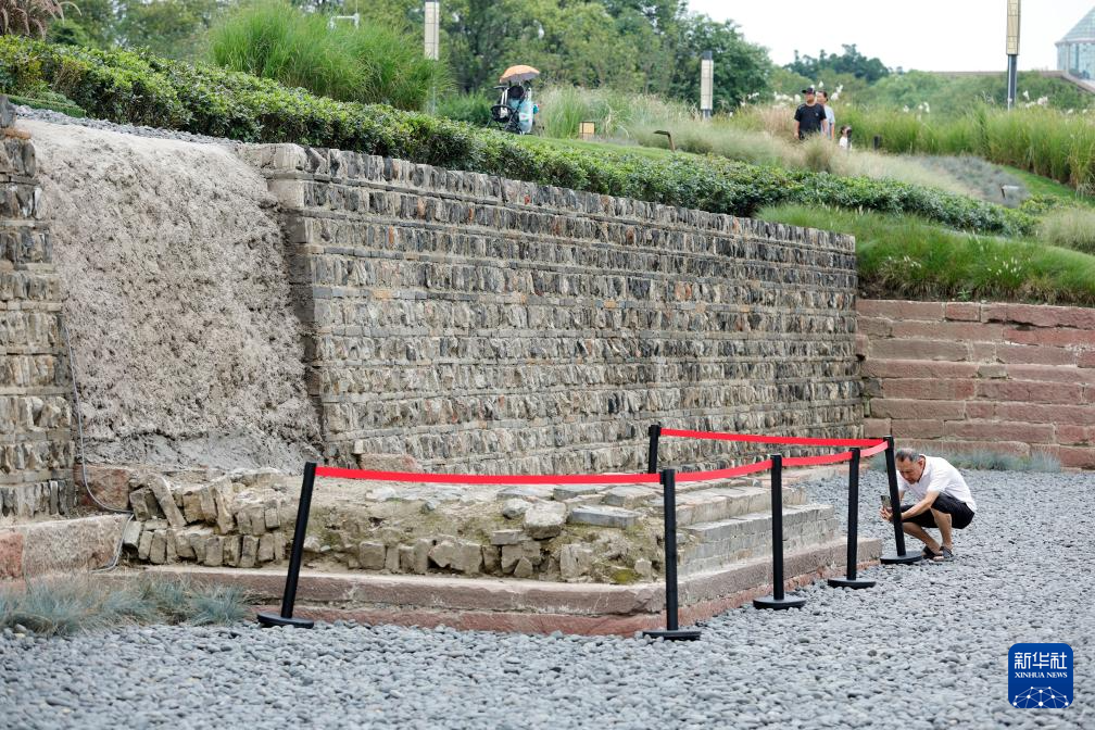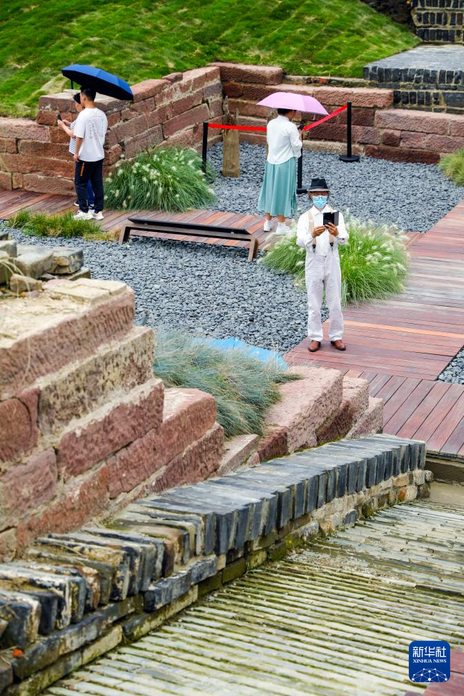 7月20日,在成都東華門遺址公園外場遺址區,人們在參觀原狀展示的明代蜀王府水道踏道遺跡。