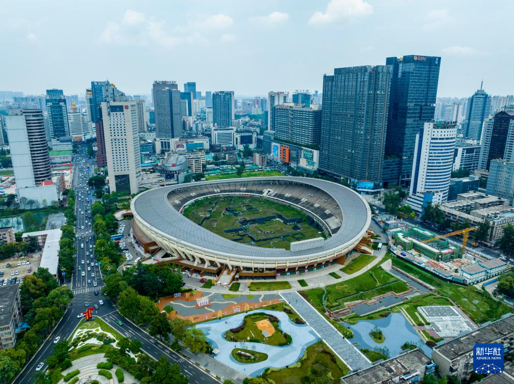 7月20日拍攝的成都東華門遺址公園外場遺址區(下)以及位于成都體育中心內的內場遺址區(無人機照片)。