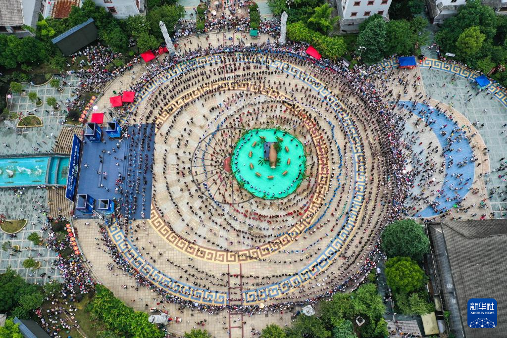 7月23日,人們在貴州劍河仰阿莎文化節上跳苗族水鼓舞(無人機拍攝)。