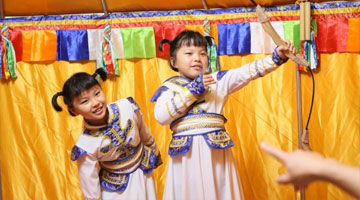 7月23日,小朋友在貴州劍河仰阿莎文化節上參加苗族水鼓舞活動。
