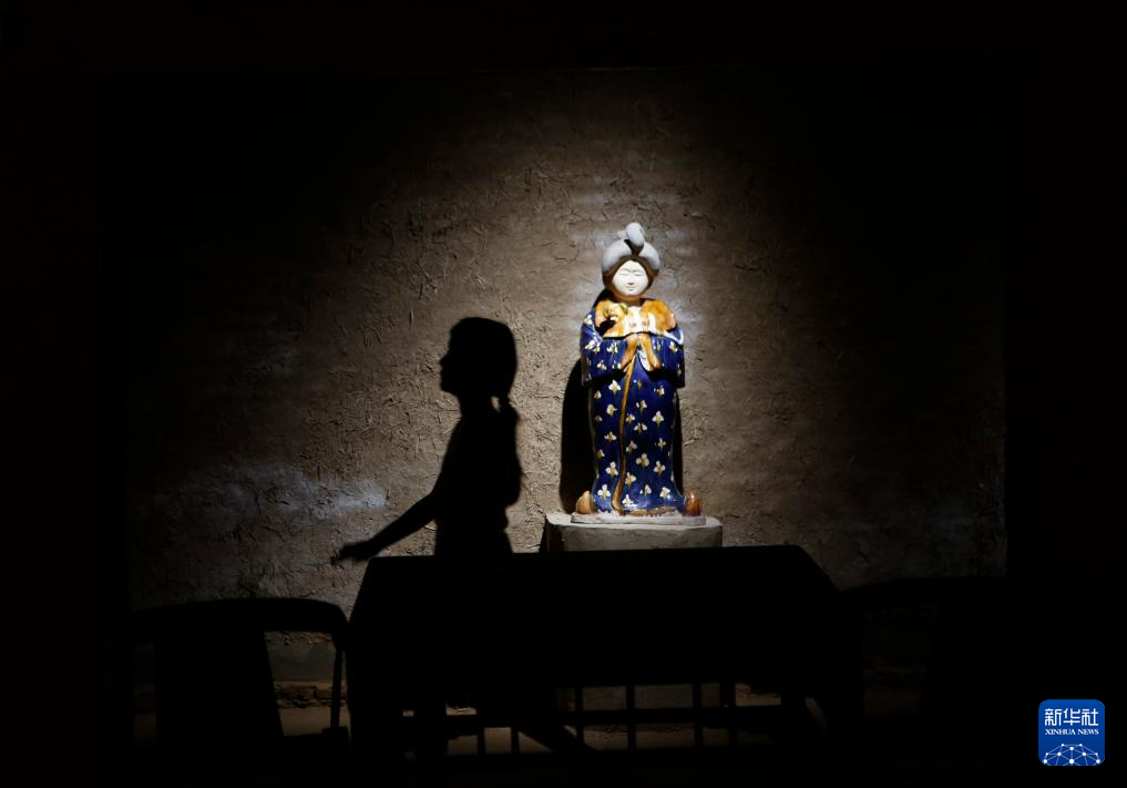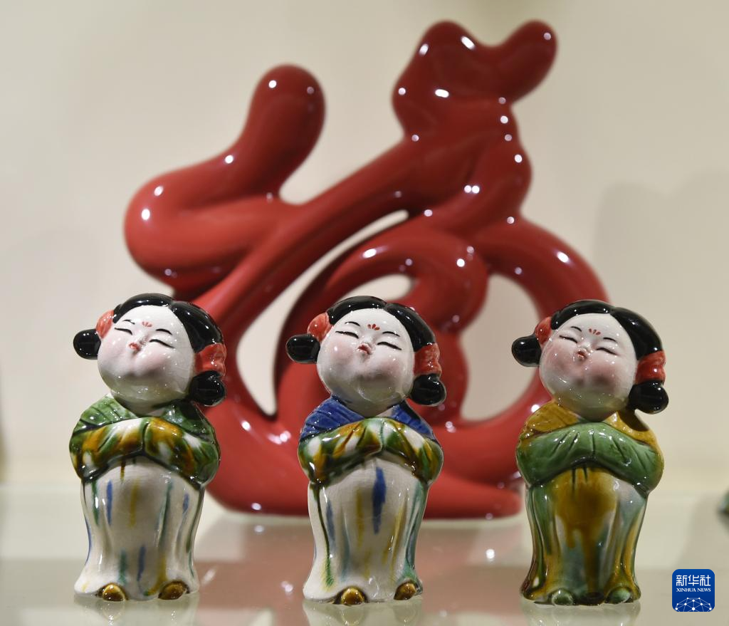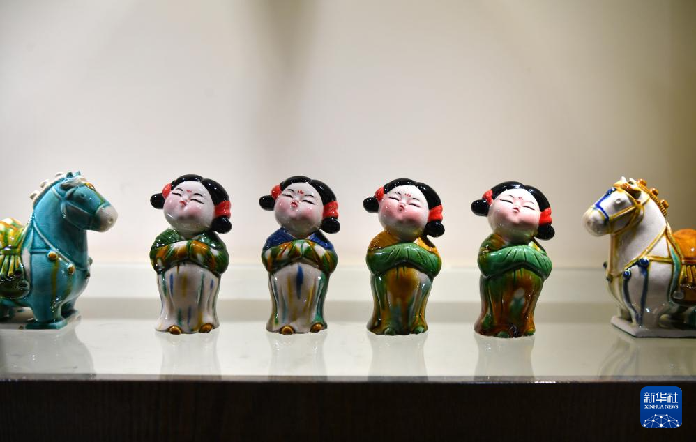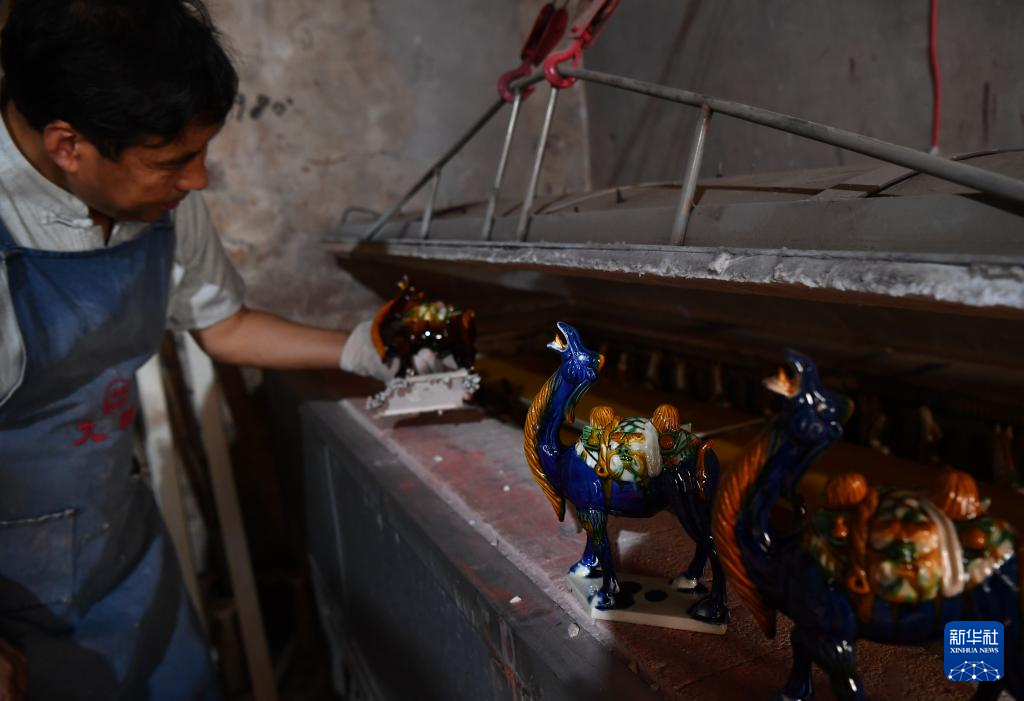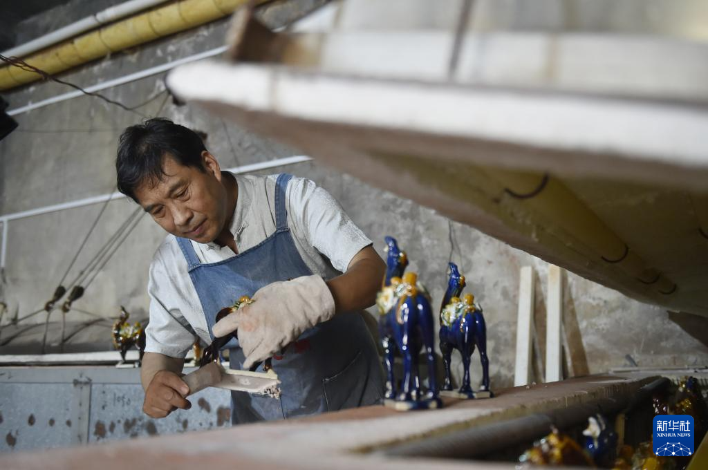 這是7月19日在南石山村一家生產企業的展廳里拍攝的唐三彩作品。