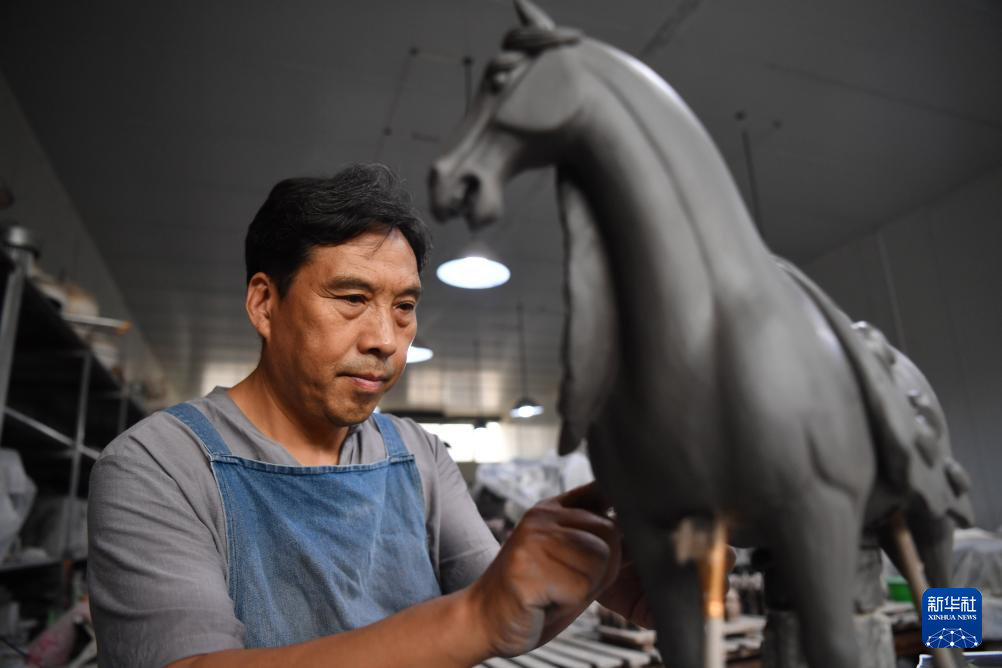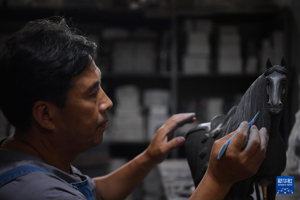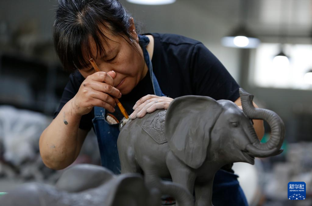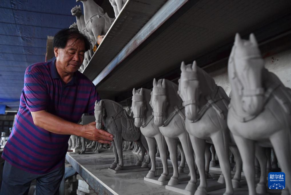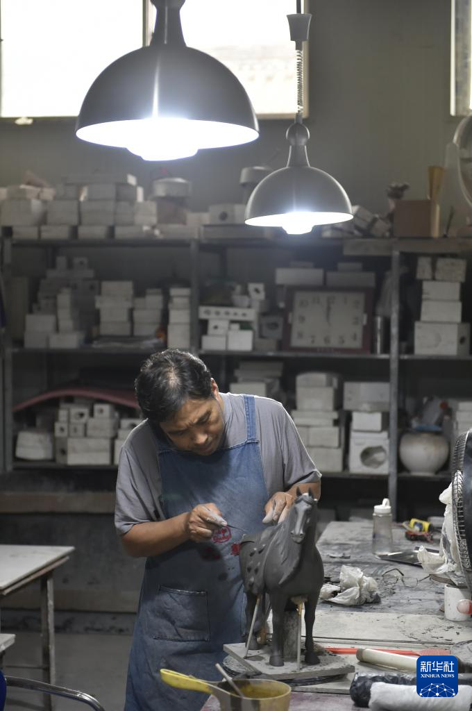 7月19日,在南石山村一家生產企業的車間里,唐三彩藝人高順旺在雕刻泥胎。