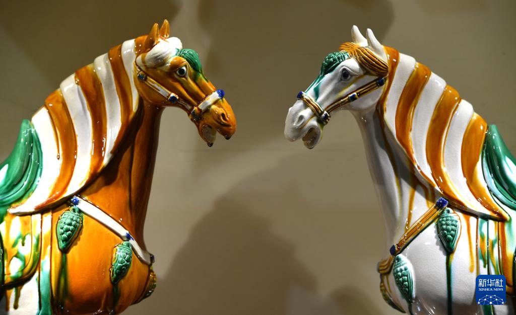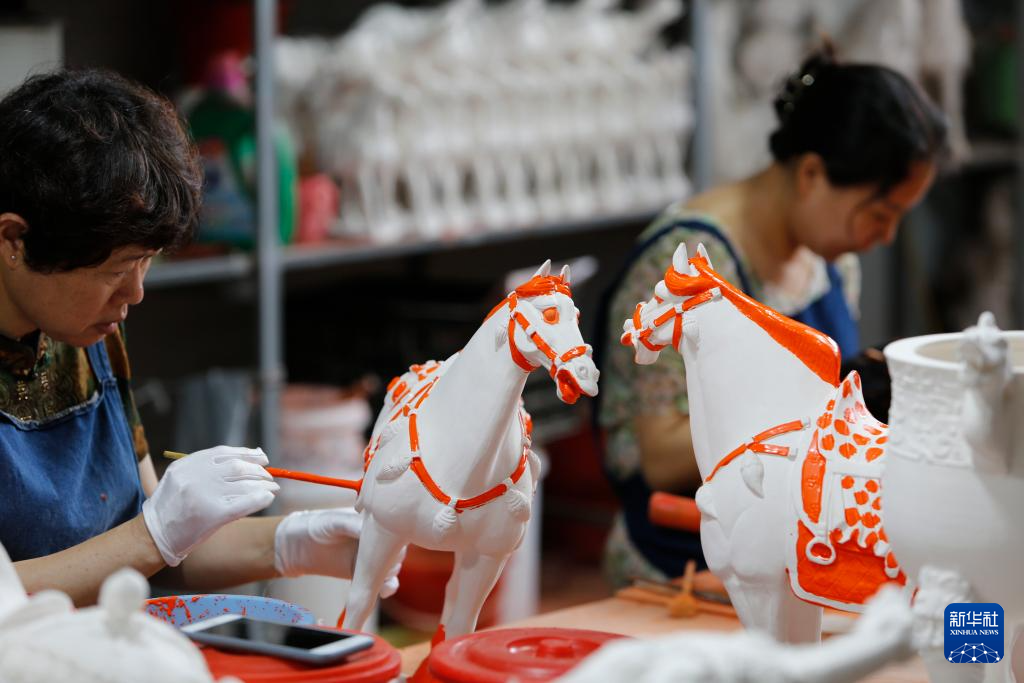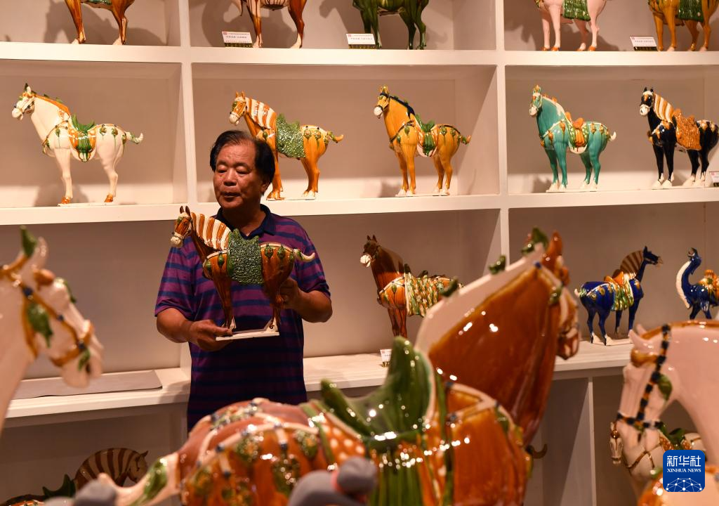 這是7月19日在南石山村一家唐三彩生產企業的展廳里拍攝的唐三彩作品。