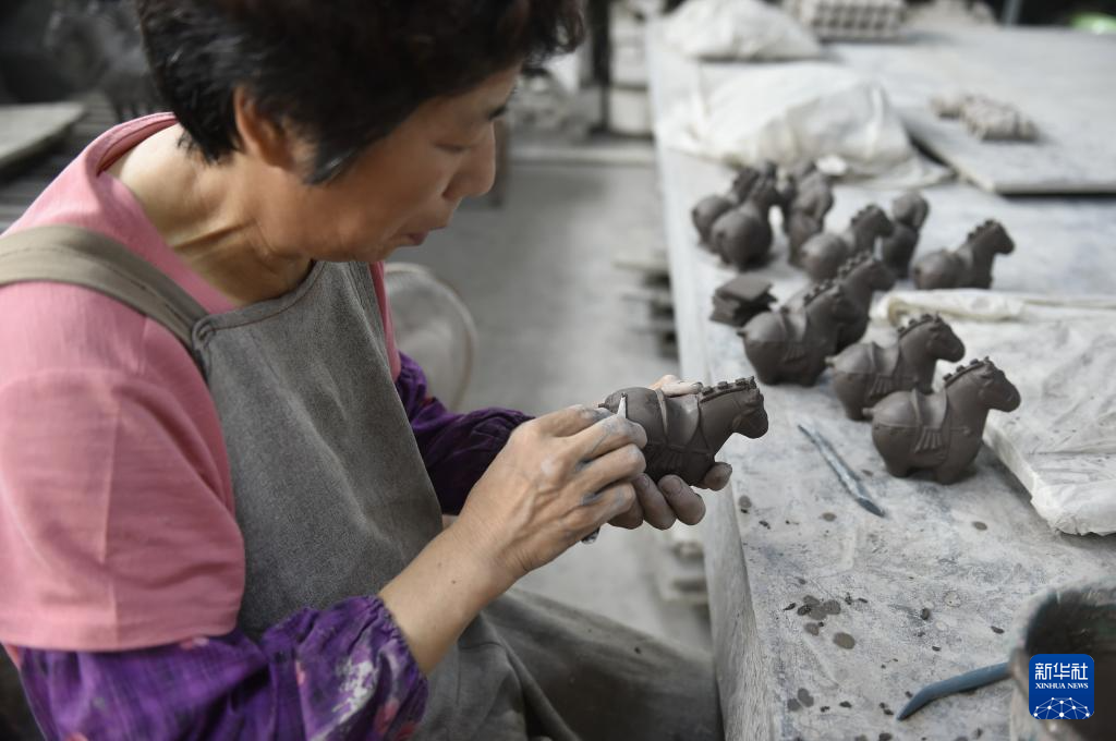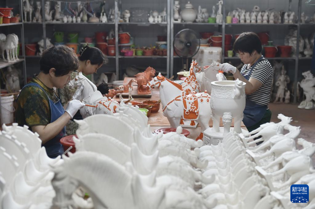 7月19日,在南石山村一家唐三彩生產企業的車間里,工人在加工泥胎。