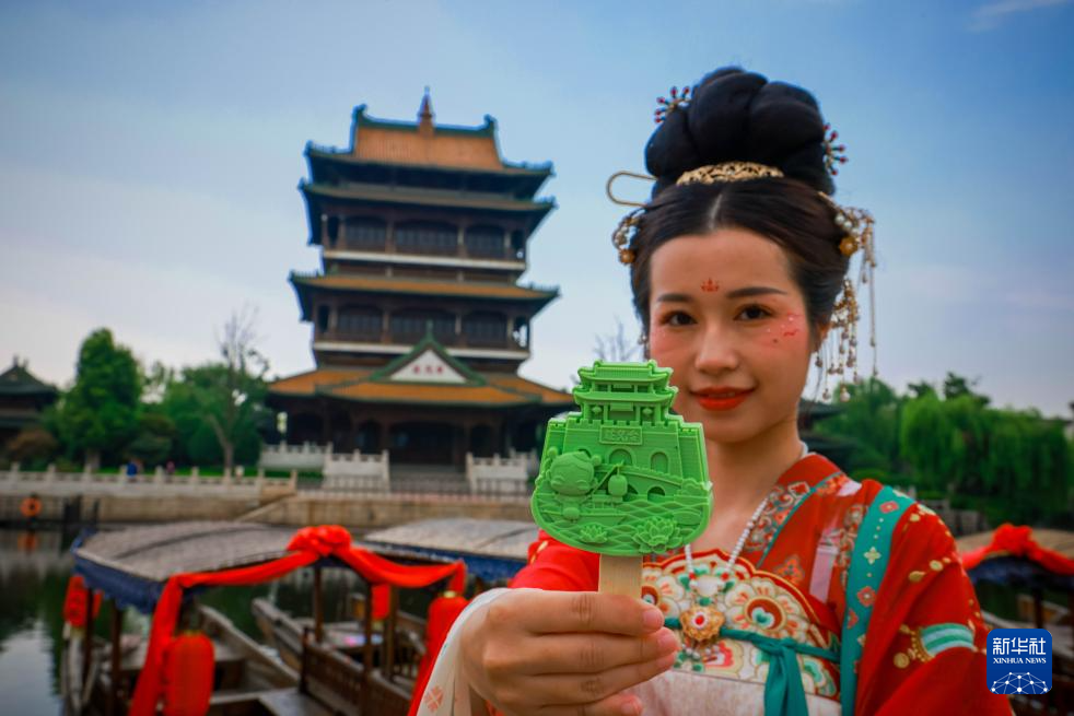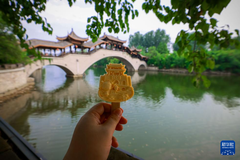 7月20日在山東省棗莊市臺兒莊古城拍攝古建筑造型文創雪糕。