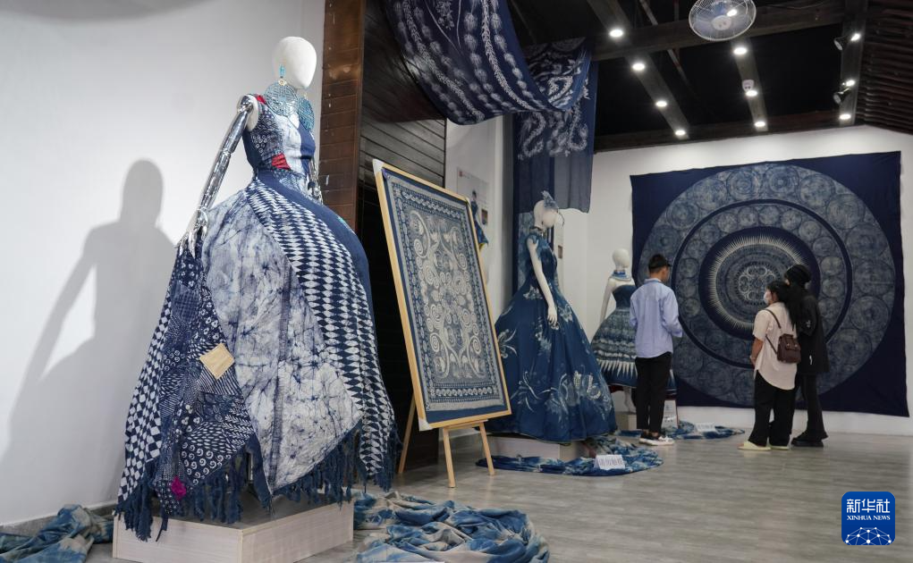 7月21日,游客在貴州省黔東南苗族侗族自治州丹寨縣萬達小鎮苗族蠟染非遺展示館觀賞蠟染展品。