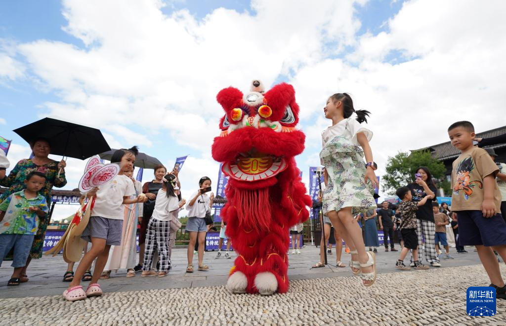 7月21日,在貴州省黔東南苗族侗族自治州丹寨縣萬達小鎮,小朋友與“南海醒獅”表演者互動。