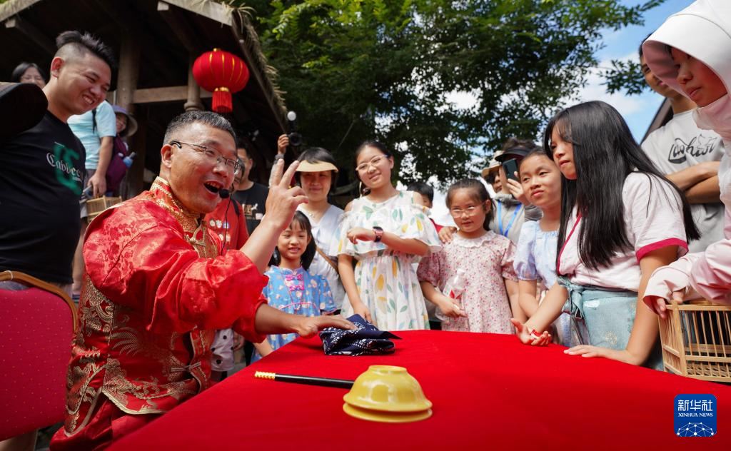 7月21日,非遺傳承人在貴州省黔東南苗族侗族自治州丹寨縣萬達小鎮表演“古彩戲法”。