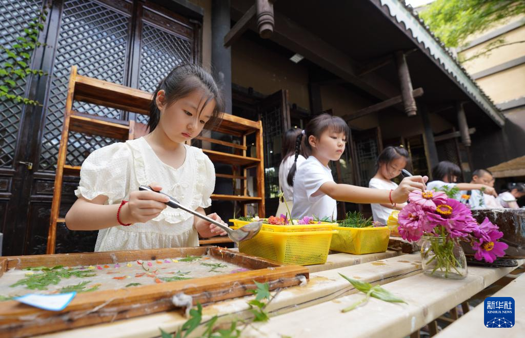 7月21日,小朋友在貴州省黔東南苗族侗族自治州丹寨縣萬達小鎮體驗“古法造紙”。