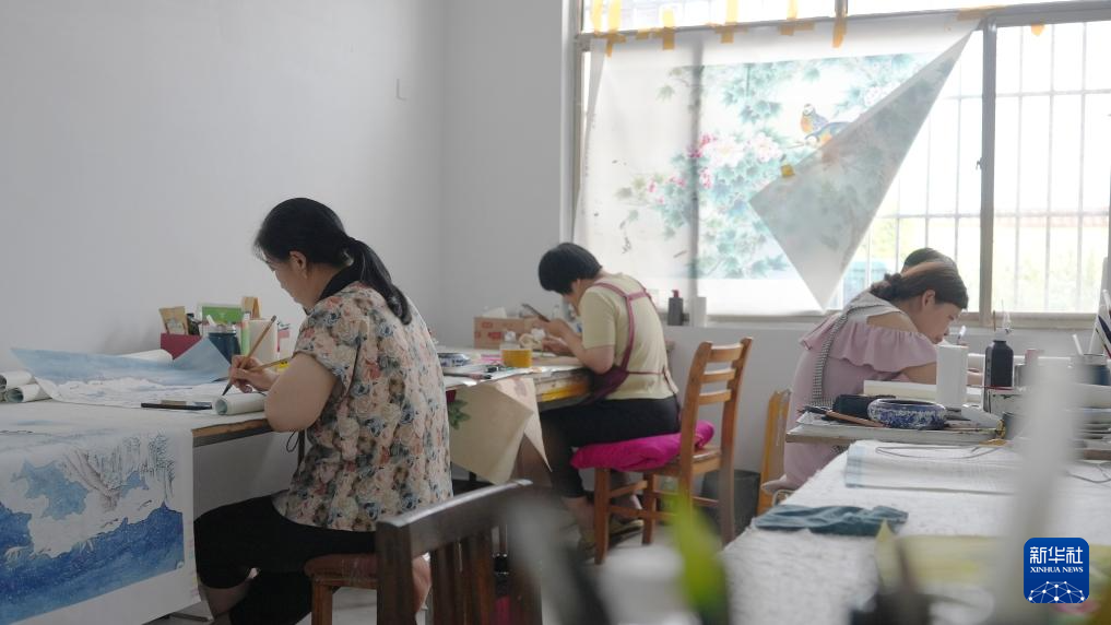 7月24日,畫師在山東省巨野縣永豐街道辦事處洪廟村鄉村畫院繪制工筆畫作品。