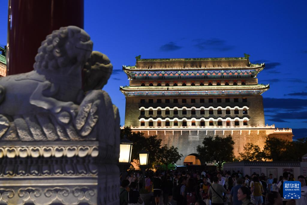 游客在正陽門箭樓前的前門大街參觀游覽(7月6日攝)。正陽門是中國明、清兩代王朝都城的正南門,坐落在老北京城的南北中軸線上,俗稱前門。1988年,正陽門城樓和箭樓被國務院批準列入第三批全國重點文物保護單位。