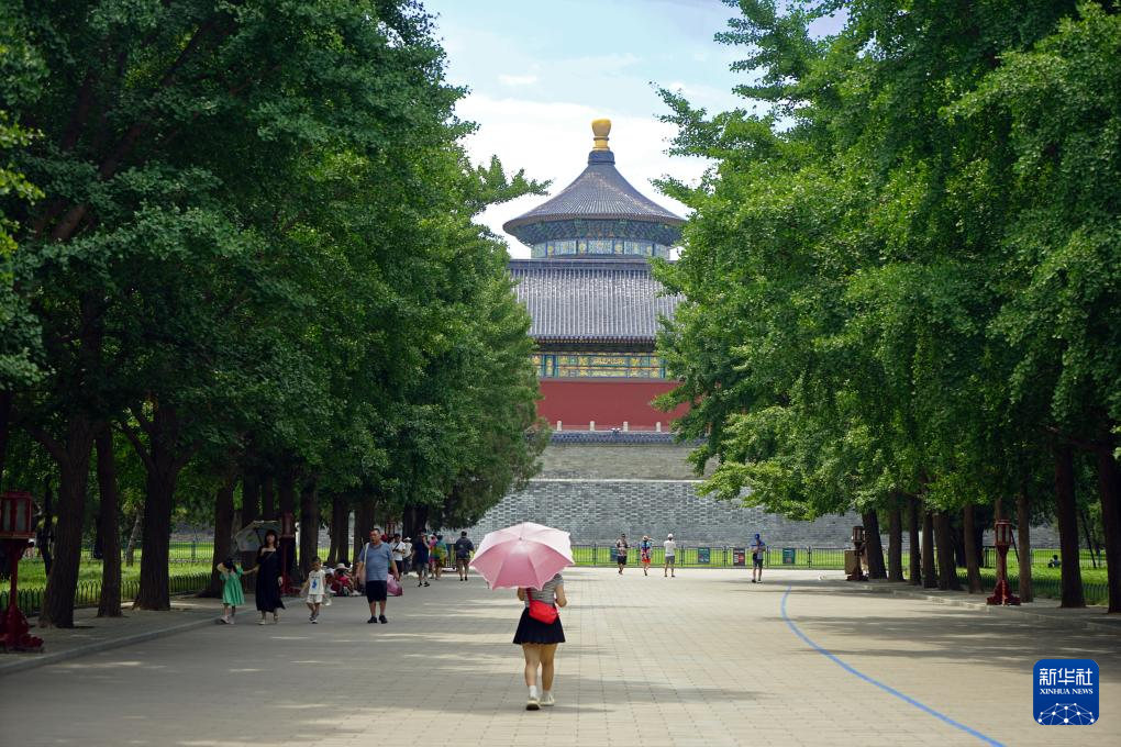 游客從天壇雙環萬壽亭前走過(7月10日攝)。天壇始建于明永樂十八年(1420年),是世界上現存規模最大、保存最完整的古代祭天建筑群,1998年被列入世界文化遺產名錄。
