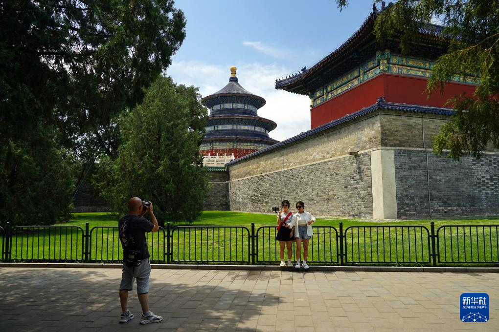 游客在天壇祈年殿外打卡拍照(7月10日攝)。天壇始建于明永樂十八年(1420年),是世界上現存規模最大、保存最完整的古代祭天建筑群,1998年被列入世界文化遺產名錄。