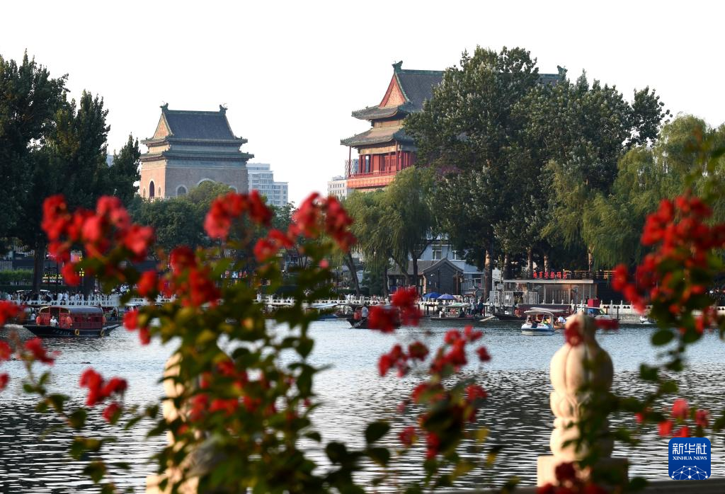 從什剎海東岸遠眺北京鐘鼓樓(7月17日攝)。鐘鼓樓位于北京中軸線的最北端,兩樓前后縱置,氣勢雄偉。作為元、明、清三代都城的報時中心,至今已有700多年的歷史。