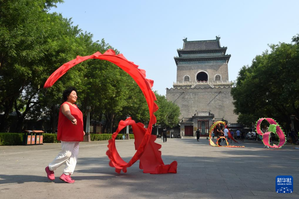 市民在北京鐘樓前鍛煉(7月18日攝)。鐘鼓樓位于北京中軸線的最北端,兩樓前后縱置,氣勢雄偉。作為元、明、清三代都城的報時中心,至今已有700多年的歷史。