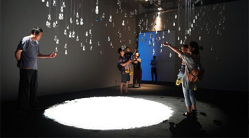 黃俊軍在觀看自己的銅雕作品《群仙祝壽圖》(7月13日攝)。