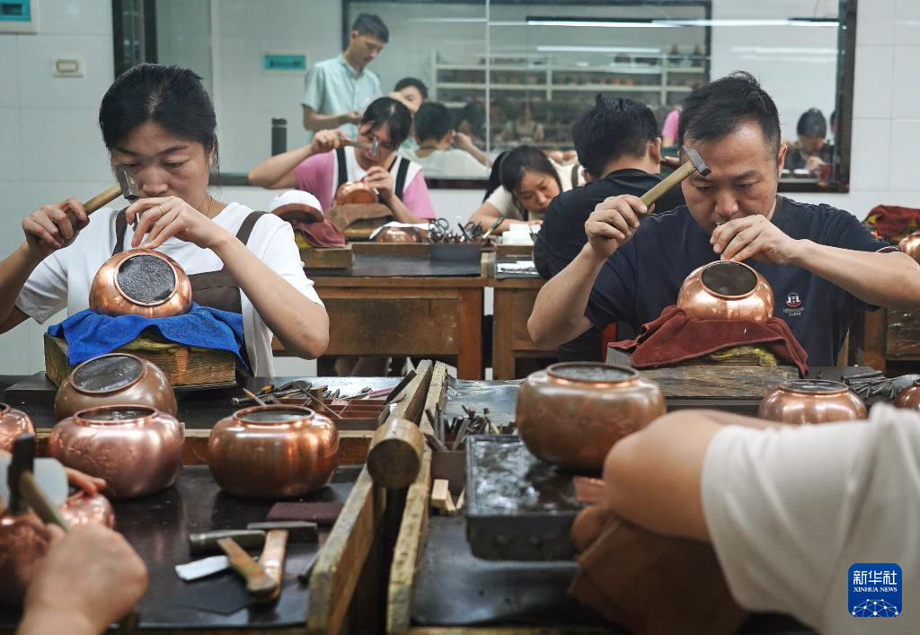 在位于江西省貴溪市的江西中鼎金屬工藝有限公司的車間里,匠人們在雕刻銅壺(7月13日攝)。