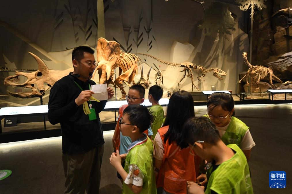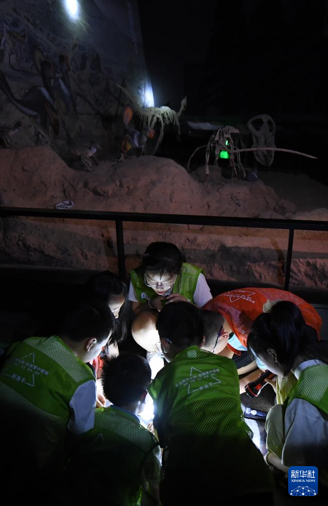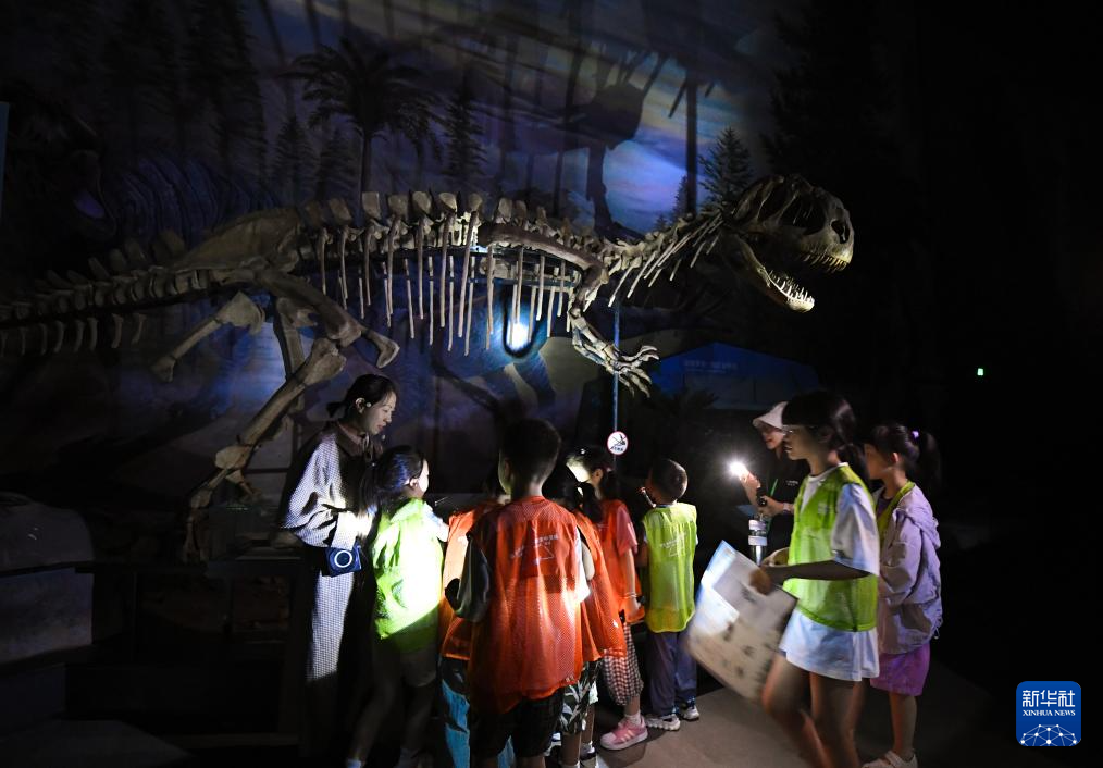 7月26日,參加夜游的孩子們在博物館內了解恐龍。