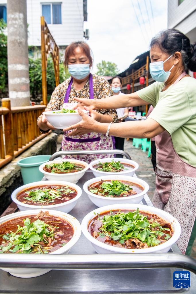 7月29日,在重慶市綦江區安穩鎮,當地居民在“苗家伏羊節”上準備羊肉長桌宴。