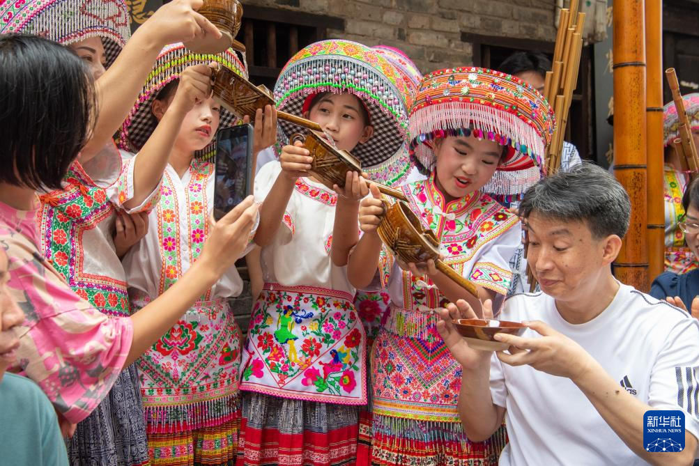 7月29日,在重慶市綦江區安穩鎮,當地居民在“苗家伏羊節”上用傳統習俗向游客表達祝福。