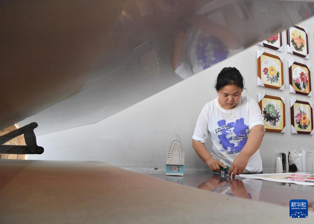 7月26日,工作人員在平樂社區的牡丹畫創意產業園區工作室內裝裱牡丹畫。