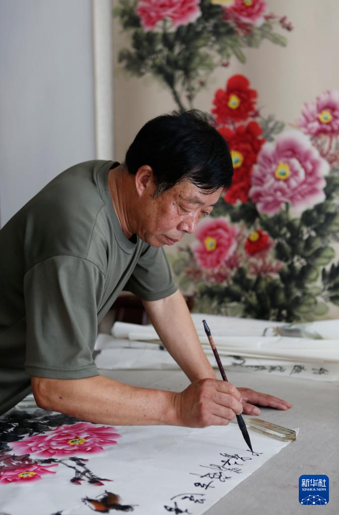 7月26日,畫師在平樂社區的牡丹畫創意產業園區工作室內繪制牡丹畫。