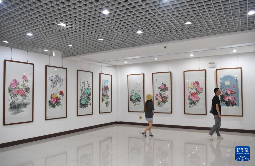 7月26日,來訪者在平樂社區的牡丹畫創意產業園區展廳內觀賞牡丹畫。