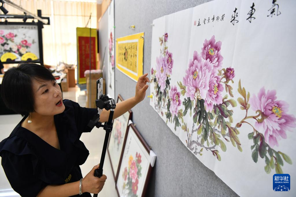 7月26日,工作人員在平樂社區的牡丹畫創意產業園區內直播銷售牡丹畫。